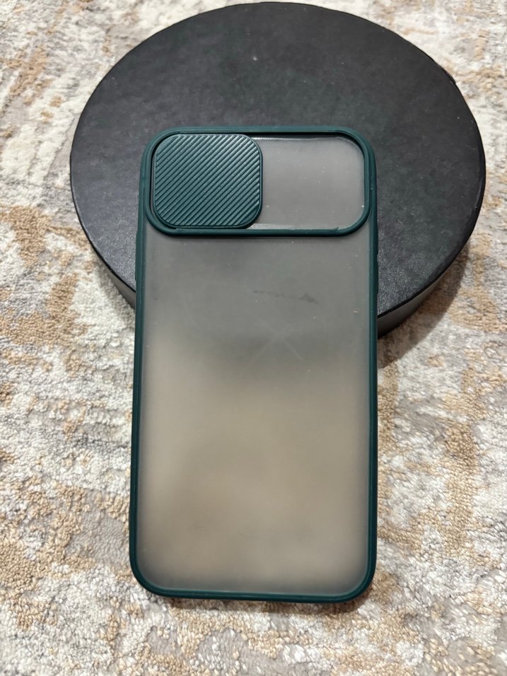 Koyu gri, şeffaf arka yüzeyli ve kamera için kaydırmalı kapaklı telefon kılıfı. Sokak stili tasarıma sahip, koruma sağlar.
