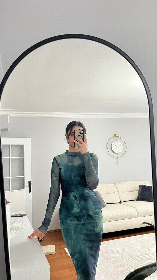 Şeffaf cam görünümlü kumaştan, gri tie-dye desenli, uzun kollu ve yüksek yakalı, fitted midi elbise. Ofis kullanımı için uygun. ️