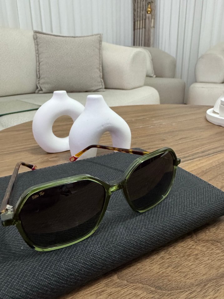 Şeffaf haki çerçeveli kadın güneş gözlüğü, retro ve minimalist tarzda, gri lenslerle sade ve şık bir görünüm sunar. ️