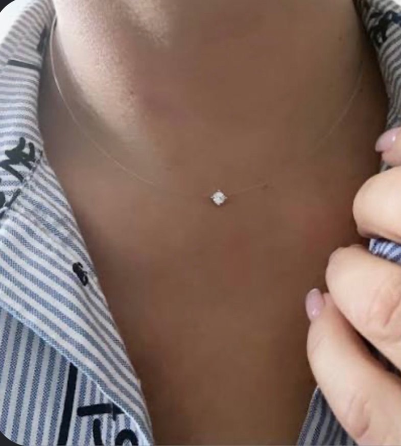 Şeffaf ipli ve tek taş detaylı ucu olan minimal kolye, gündelik ve modern şıklık için midi boyda.