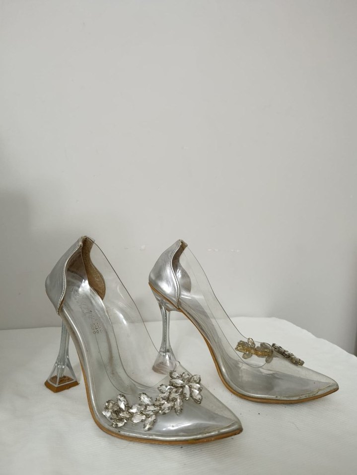 Kadınlar için şeffaf cam malzemeden yapılmış, işlemeli ve payet detaylı stiletto topuklu ayakkabılar. Beyaz ve gri tonlarda, klasik zarafetle çağdaş stil sunar.