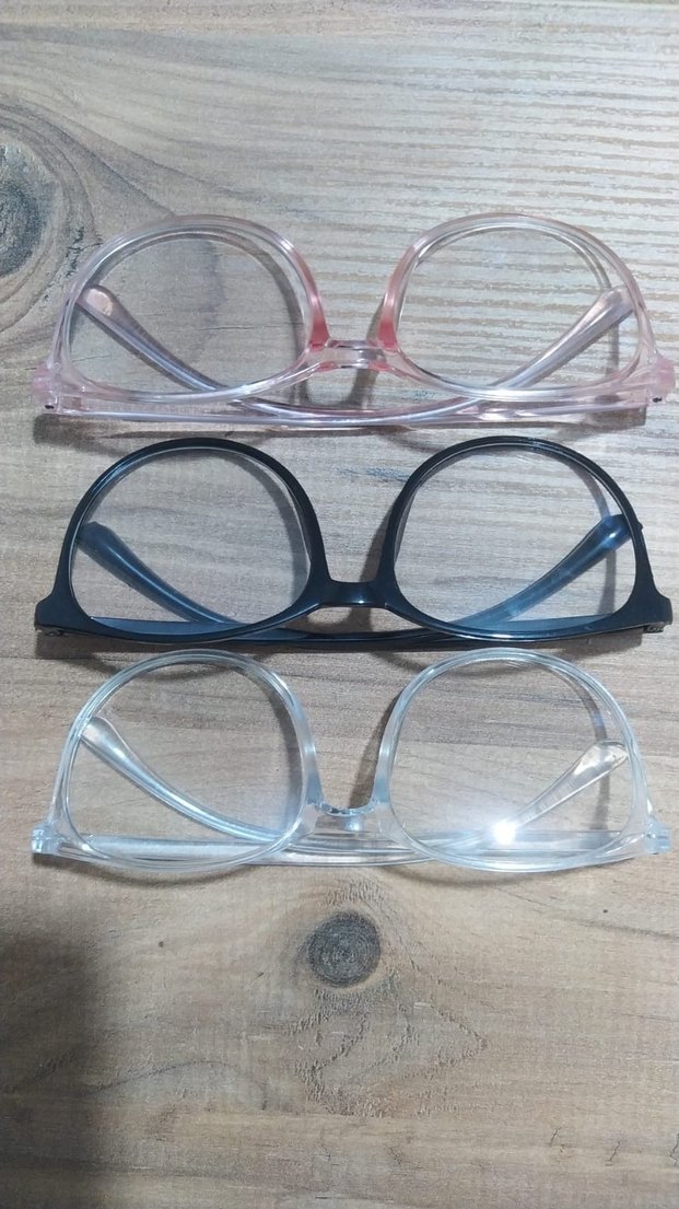 Şeffaf pembe, siyah ve kristal renklerde üç adet kadın gözlüğü seti, minimalist ve çağdaş tasarıma sahip.