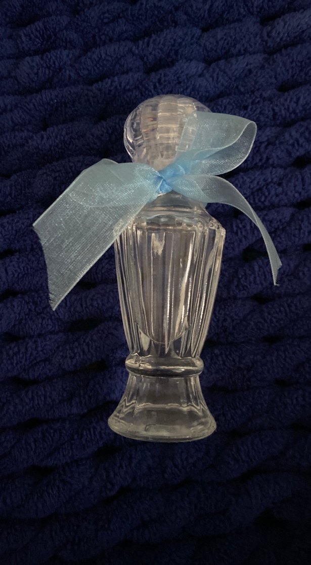 Şeffaf, keskin detaylı kadın parfüm şişesi, boynunda açık mavi kurdele ile süslenmiş.şık dolu kolonya