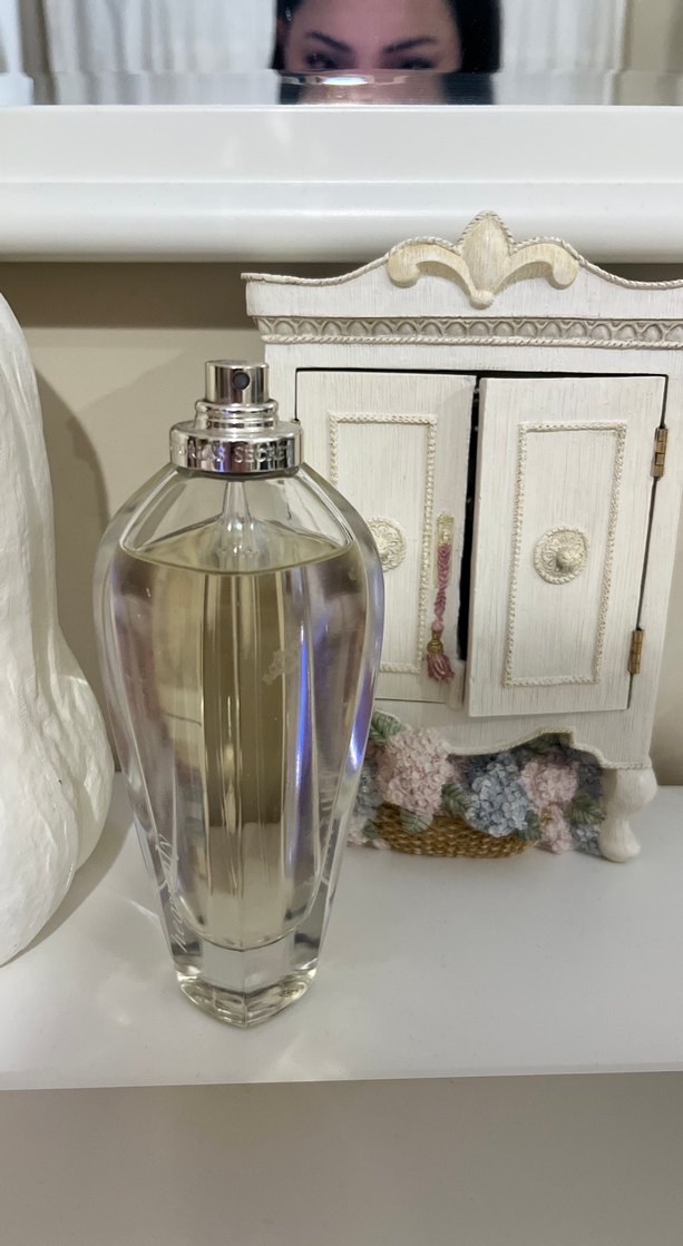 Gümüş püskürtücü başlıklı şeffaf cam kadın parfüm şişesi, beyaz yüzeyde dekoratif arka planla sergileniyor.
