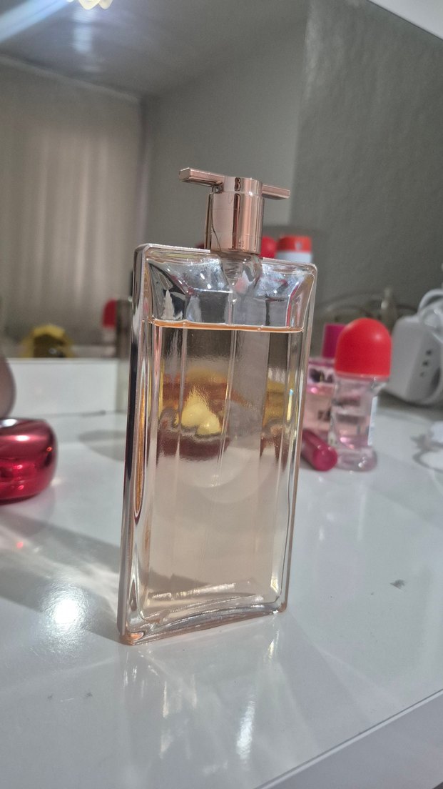 Gül altın sprey başlıklı, şeffaf cam parfüm şişesi, açık renkli koku içerir. Günlük kullanım için uygundur.