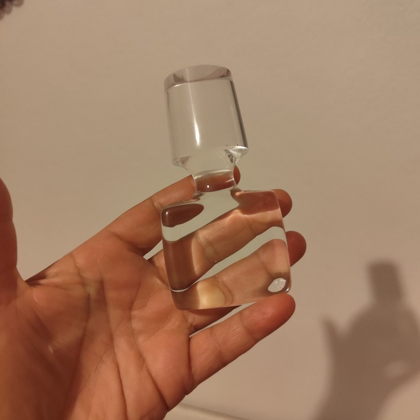 Şeffaf ve minimalist tasarıma sahip kadın parfüm şişesi. Küçük boyutlu ve elde rahat tutulur.