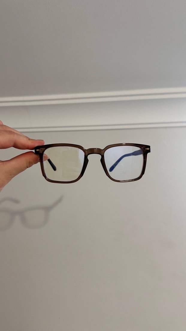 Koyu kahverengi, şeffaf çerçeveli minimalist ve sade tasarımlı çağdaş kadın gözlüğü. Düz ve temel tarz için uygun.