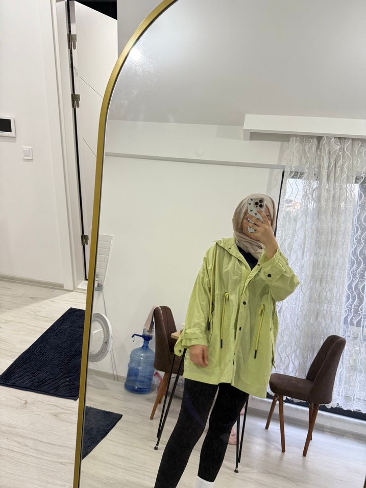 Uzun, bol kesim şeffaf sarı kadın yağmurluğu kapüşonlu ve uzun kolludur, sokak stili ve günlük kullanım için uygundur. ️