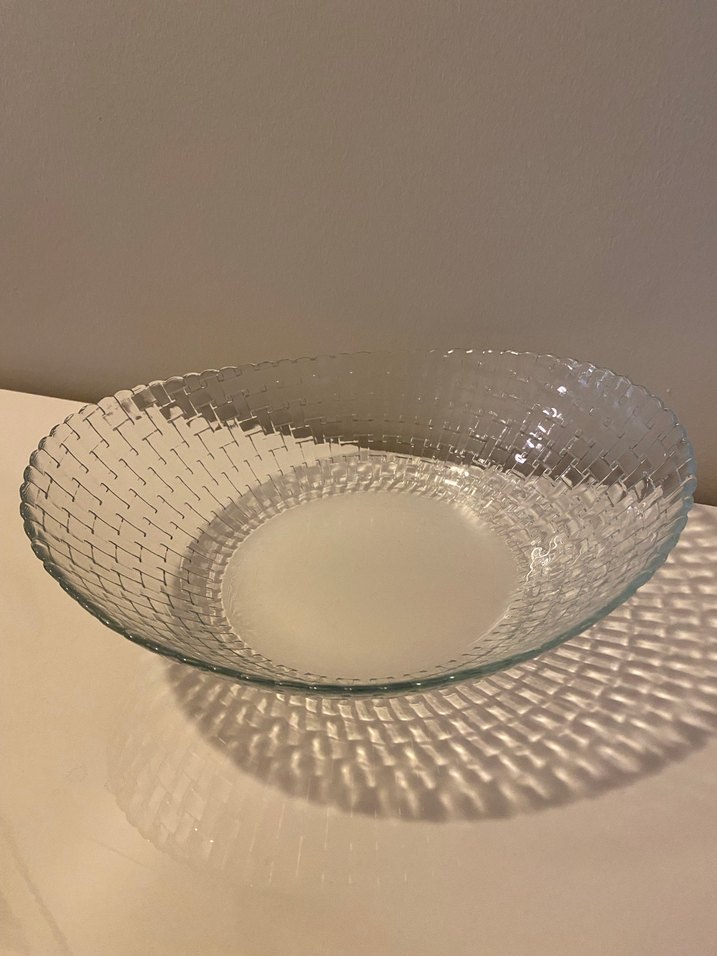 Şeffaf camdan, çağdaş kare desenli tabak. Açık bej tonlarında olup, dokulu yüzeyi sofralara zarif bir dokunuş katar. ️