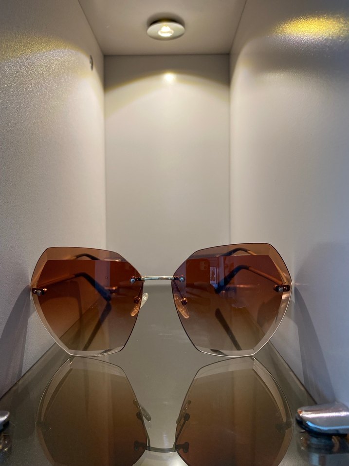 Koyu kahverengi lenslere ve şeffaf kenarlara sahip, minimalist ve çağdaş tarzda kadın güneş gözlüğü. Trendsetterlar için avant-garde bir seçim. Bana büyük geldiği için satıyorum.