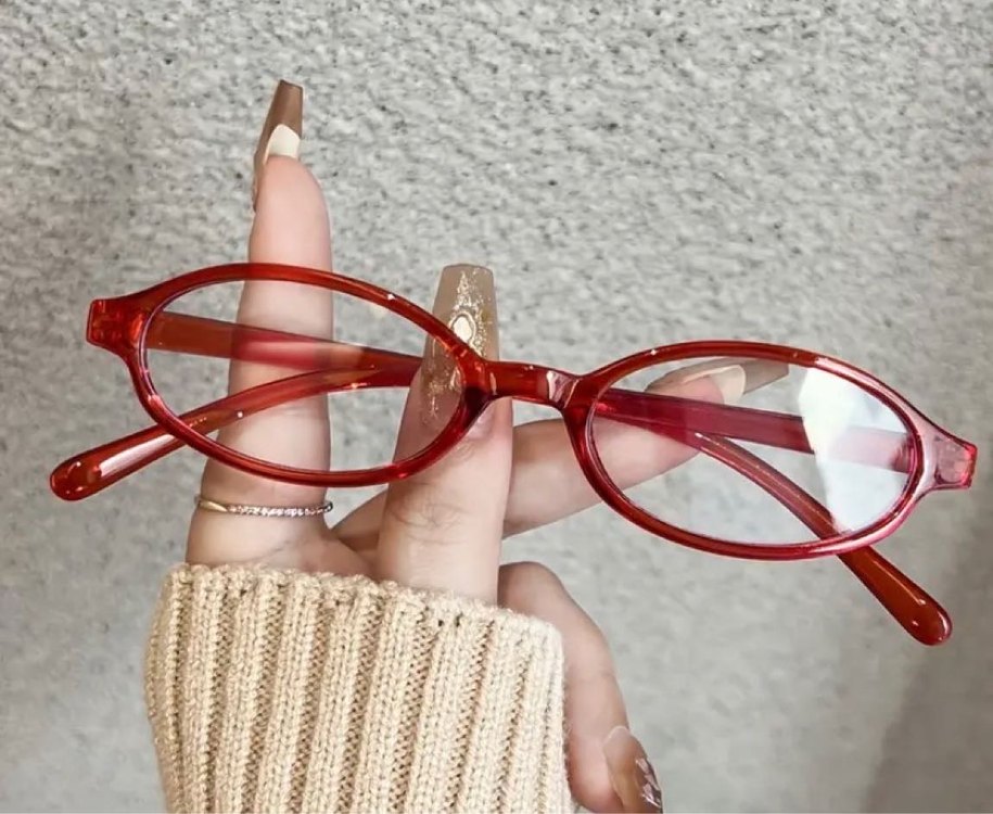 Şeffaf kırmızı renkte, retro tarzda kadın gözlüğü. Hafif ve çağdaş tasarımı bohem ve hippie stillerine uygundur.