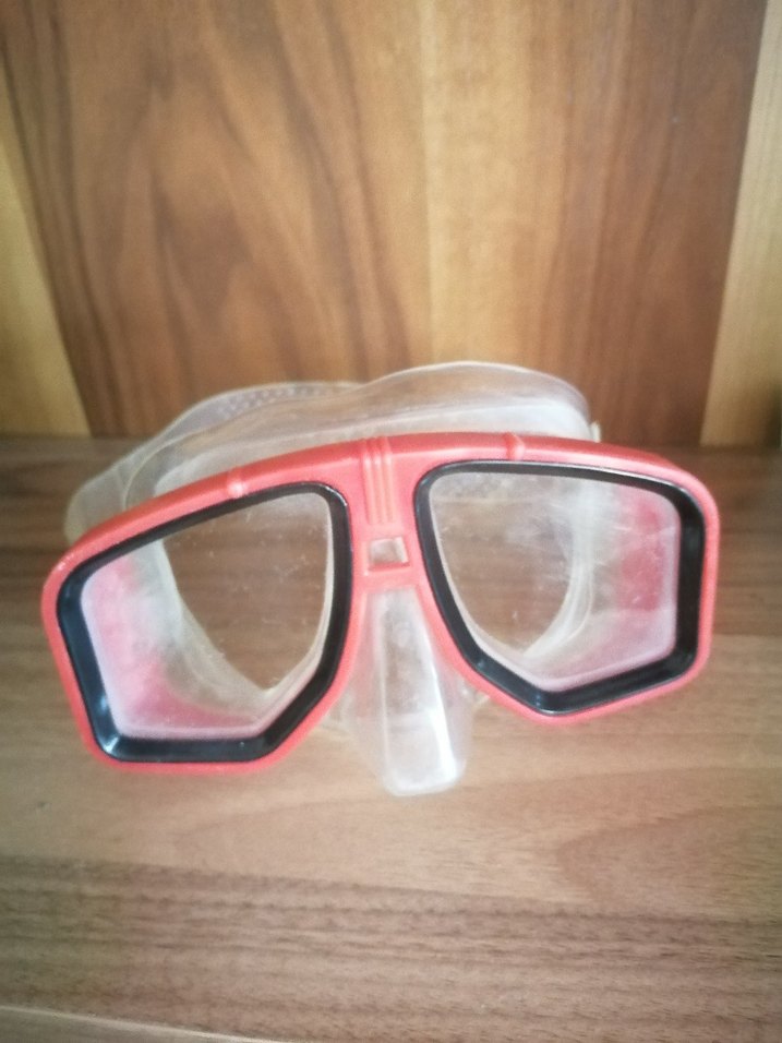 Şeffaf camlı, kırmızı renkli ve retro tarzda, plaj için uygun, vücuda oturan yüzücü gözlüğü. ️