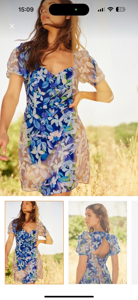 Şeffaf kısa kollu, askısız yakalı, mavi çiçek desenli, bohem tarzda mini elbise. Doğa için uygun.