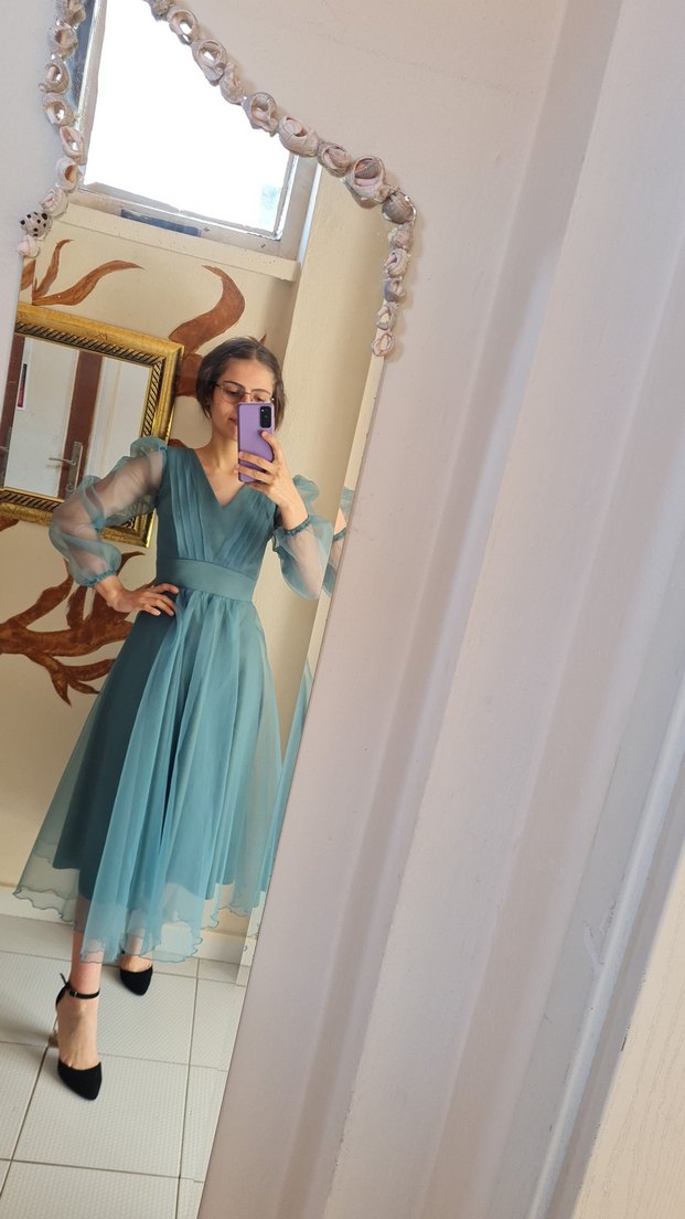 V yakalı, şeffaf uzun kollu Normal kesim düğün vs için uygundur. İlk görsel elbisenin asıl rengidir.