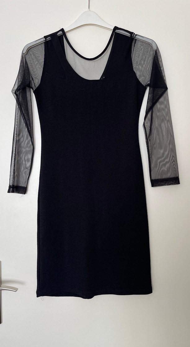 Bu siyah, vücuda oturan midi elbise şeffaf uzun kollara ve straplez yakaya sahiptir, gotik parti için uygundur.