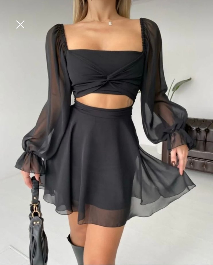 Siyah mini elbise, straplez yaka ve şeffaf uzun kollara sahiptir. Yumuşak sentetik kumaştan üretilmiş, flared etek detayıyla romantik geceler için uygundur. Hiç kullanılmadı. Etiketi üzerinde mevcut. Üzerimdeki duruşu da fotoğraflarda ekli.