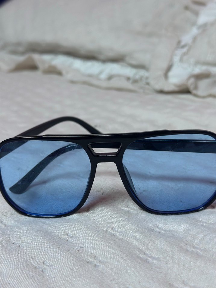Şeffaf çerçeveli, koyu mavi renkte, minimalist ve sade tarzda kadın güneş gözlüğü. Counterculture havası taşıyan sade tasarım. Tane olarak