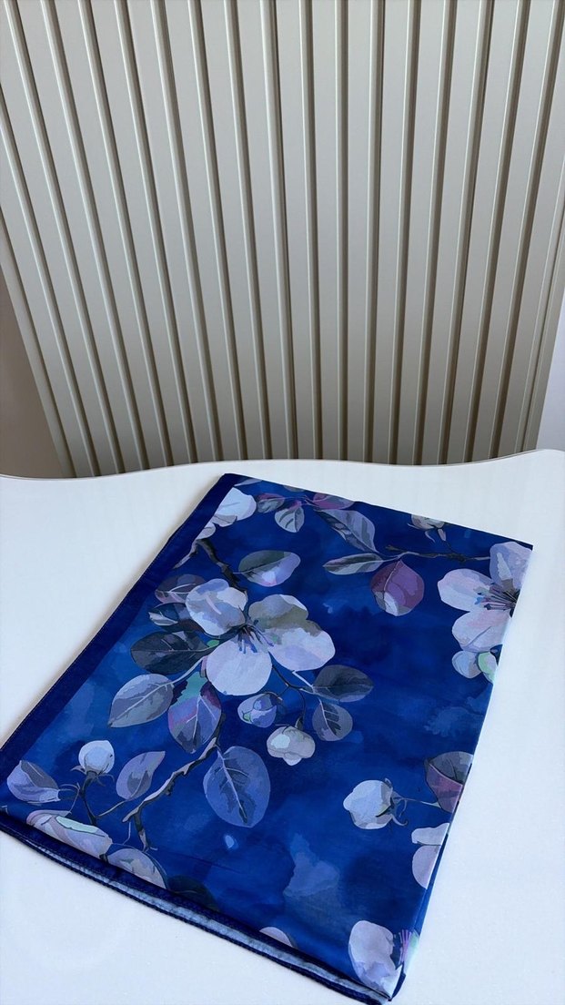 Şeffaf sentetik kumaştan yapılmış koyu mavi kadın fular, çiçek desenli, çağdaş ve minimalist bir tarz sunar.