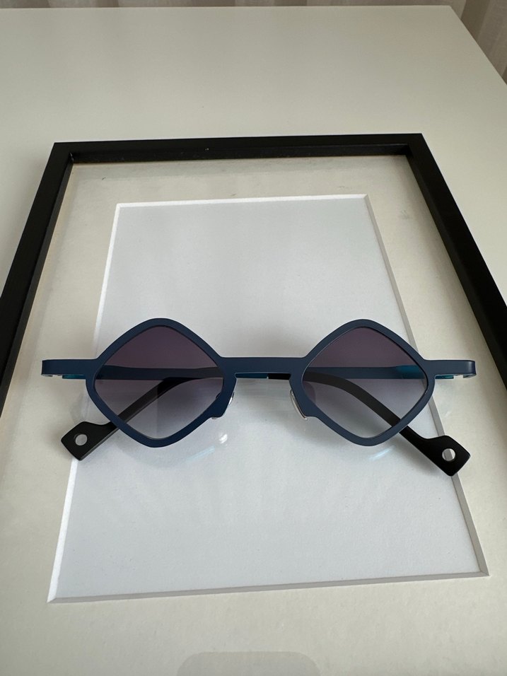 Şeffaf, koyu mavi tonlarında, minimalist ve avangart tasarıma sahip kadın gözlüğü, çağdaş ve modaya uygun.