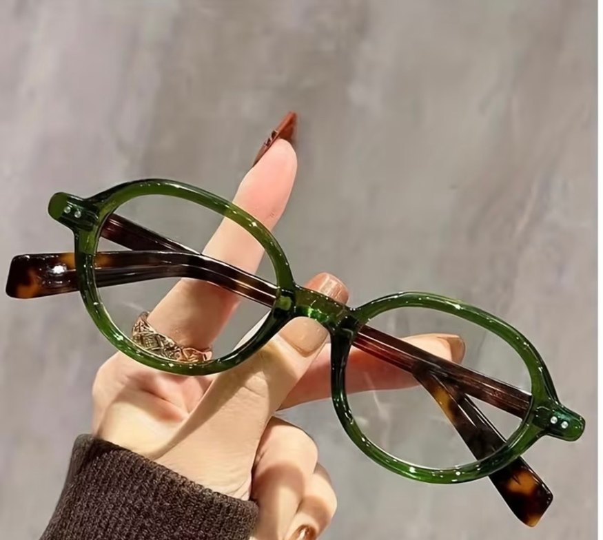 Şeffaf koyu yeşil çerçeveli, bohem ve retro tarzları yansıtan modern Parisli kadın gözlüğü.