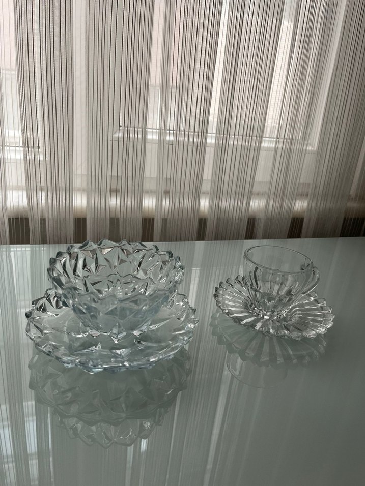 Kristal desenli şeffaf çay fincanı ve tabağı seti, yanında uyumlu tabaklarla birlikte. Şık sunum için idealdir. ☕ takım değildir ben takım yaptım ayrı ayrı satın alma isterseniz ilan açıyorum bu ilan kase ve tabak içindir 12 parçandan oluşmaktadır
