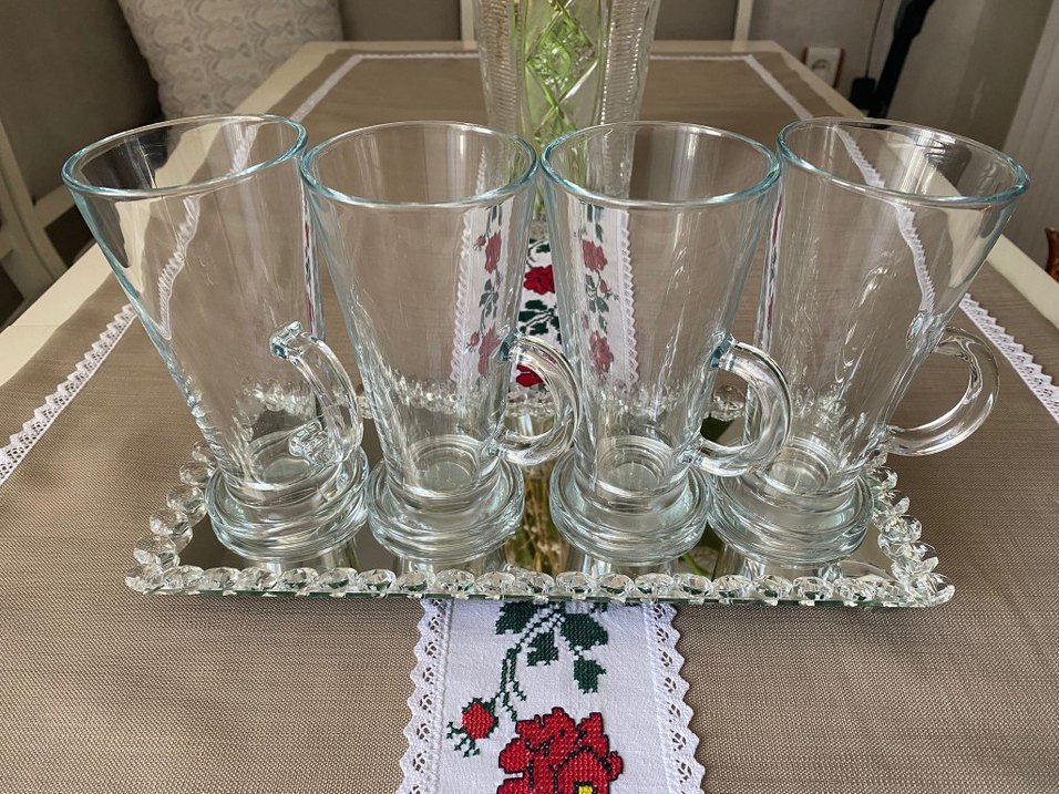 Kulplu, şeffaf cam bardaklar. aynalı sunum tepsisi az kullanıldı temizdir