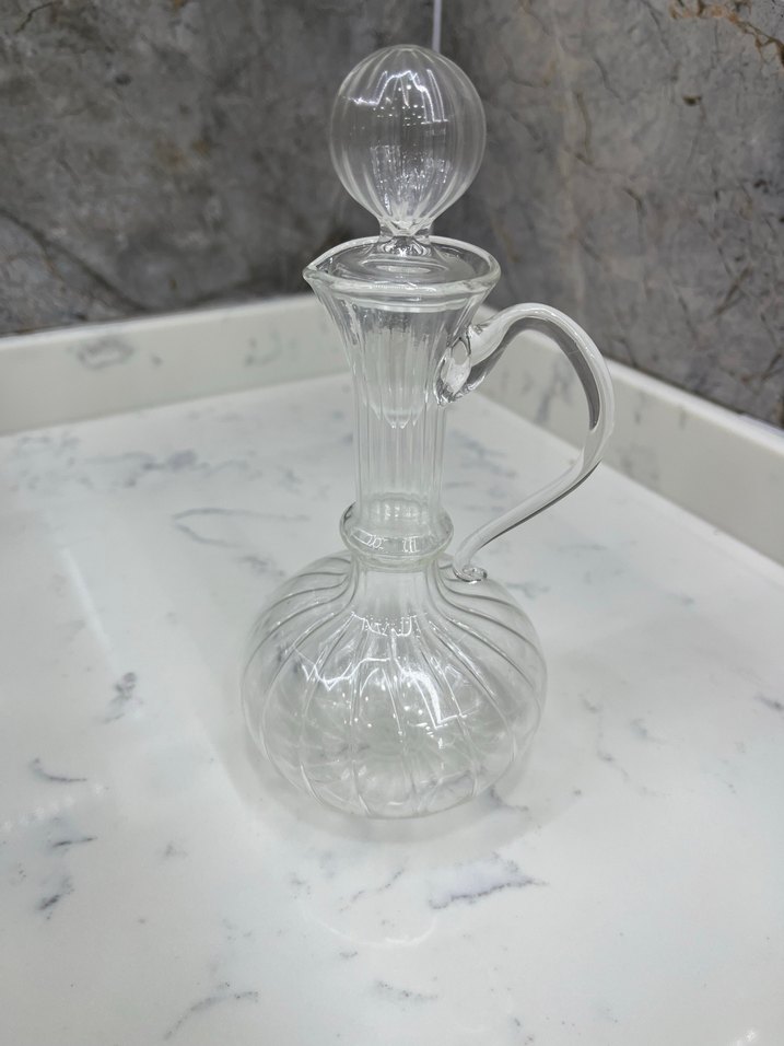 Dikey kabartmalı yuvarlak gövdeye ve kıvrımlı kulpa sahip şeffaf vazo, küresel tıpa ile tamamlanmıştır. Hafif ve zarif bir görünüme sahiptir.