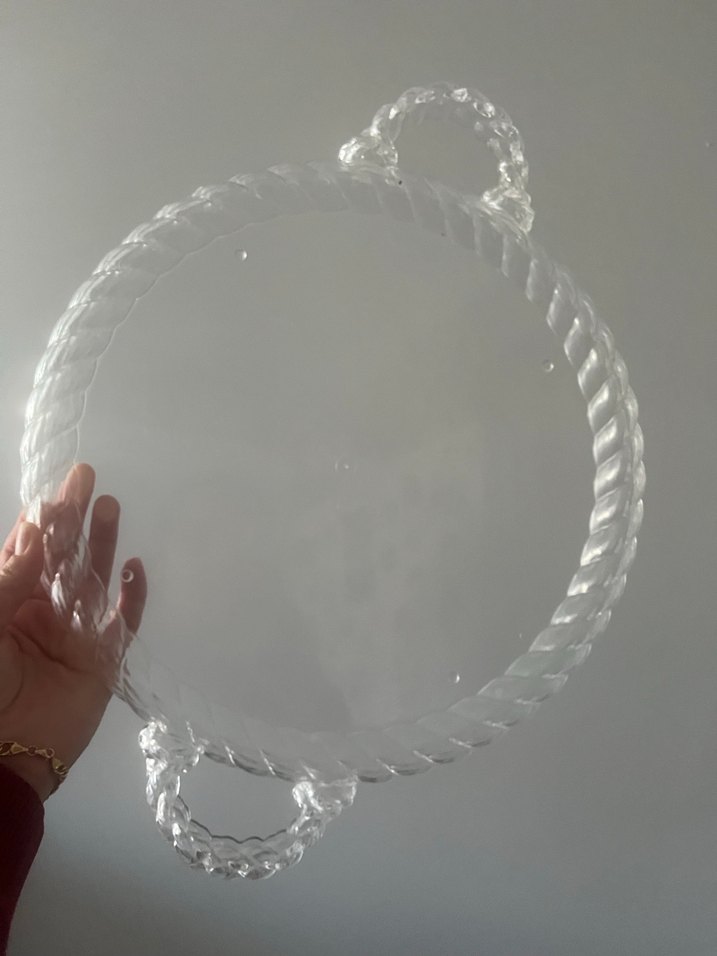 Şeffaf yuvarlak tepsi, taşıma kolaylığı sağlayan bükümlü kulplara sahiptir. Düz ve hafif tasarımıyla klasik sofra düzenlerine uygundur. ️plastik örgü kurplu