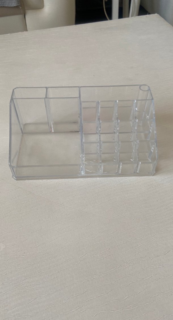 Çeşitli kozmetik ve araçları düzenlemek için çoklu bölmelere sahip şeffaf makyaj organizer kutusu. İçindekiler kolayca görülebilir.