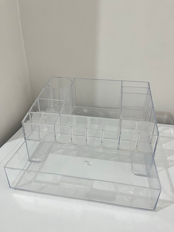 Bu şeffaf makyaj organizerı, kozmetik ve aksesuarları düzenli tutmak için çoklu bölmelere sahiptir. Kompakt tasarımıyla her yüzeye kolayca sığar.