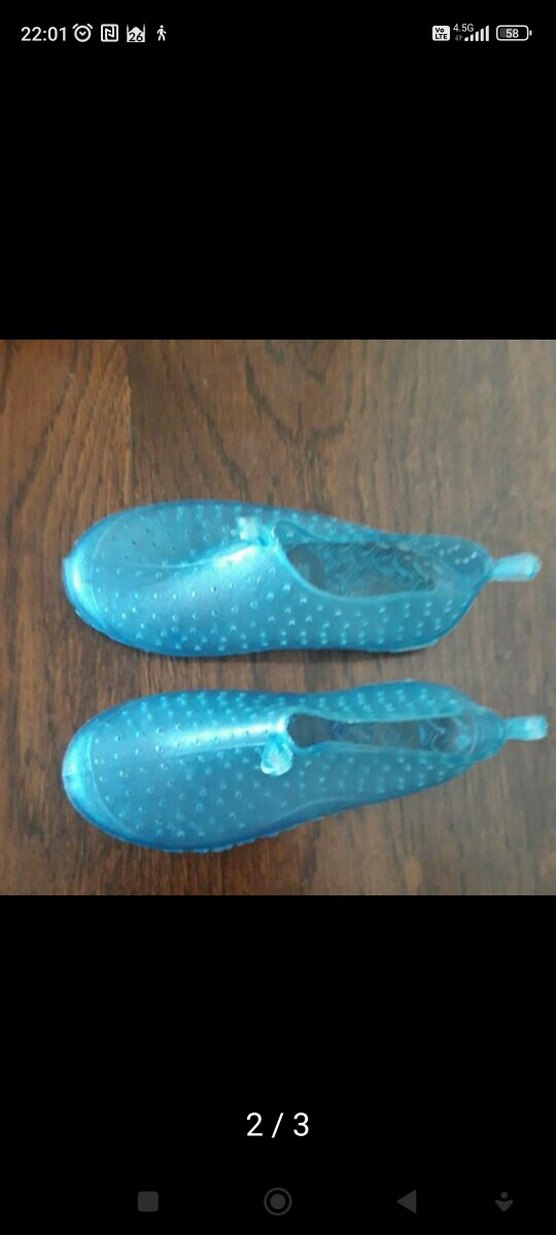 Şeffaf mavi renkte, kauçuk malzemeden yapılmış erkek su ayakkabısı. Minimalist ve bohem tarzda, günlük kullanım için uygun, renkli bir model. 26 numara