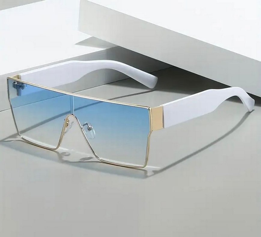 Şeffaf açık mavi camlı, minimalist ve çağdaş tasarımlı kadın gözlüğü. Moda ve öncü tarzıyla dikkat çeker.