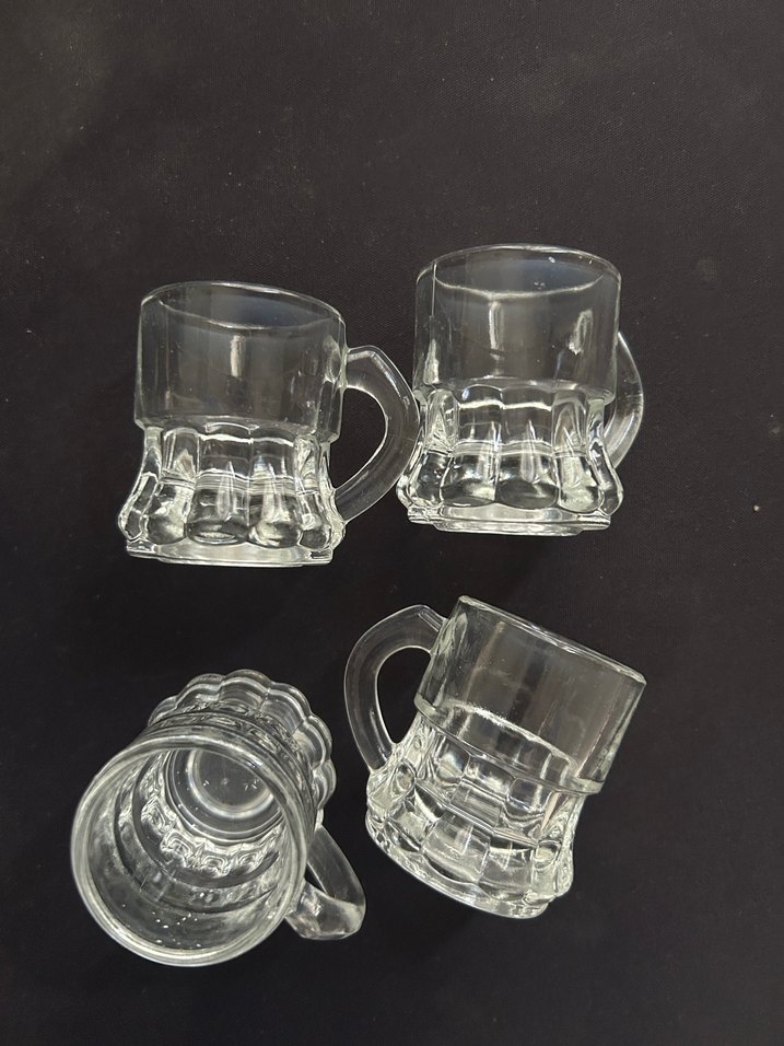 Kulplu, sağlam tabanlı dört adet şeffaf mini cam kupa seti. Küçük içecekler için uygun. Hiç kullanılmamıştır. Çok tatlılar. 4 lü fiyattır
