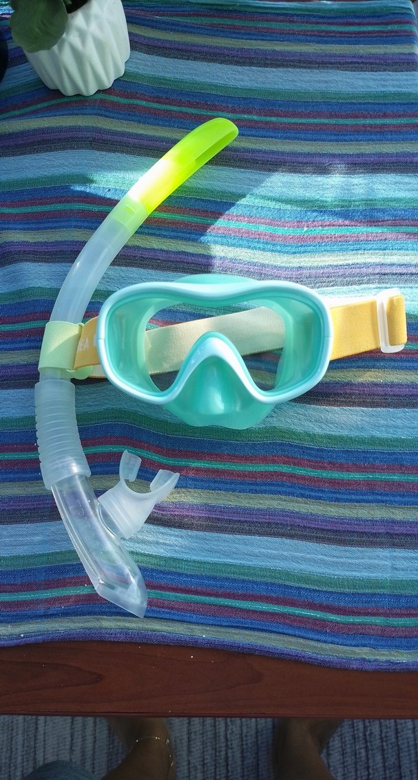 Şeffaf ve mini boyda, pastel mavi tie-dye desenli dalış gözlüğü ve kısa şnorkel, plajda tarzınızı tamamlar. s beden