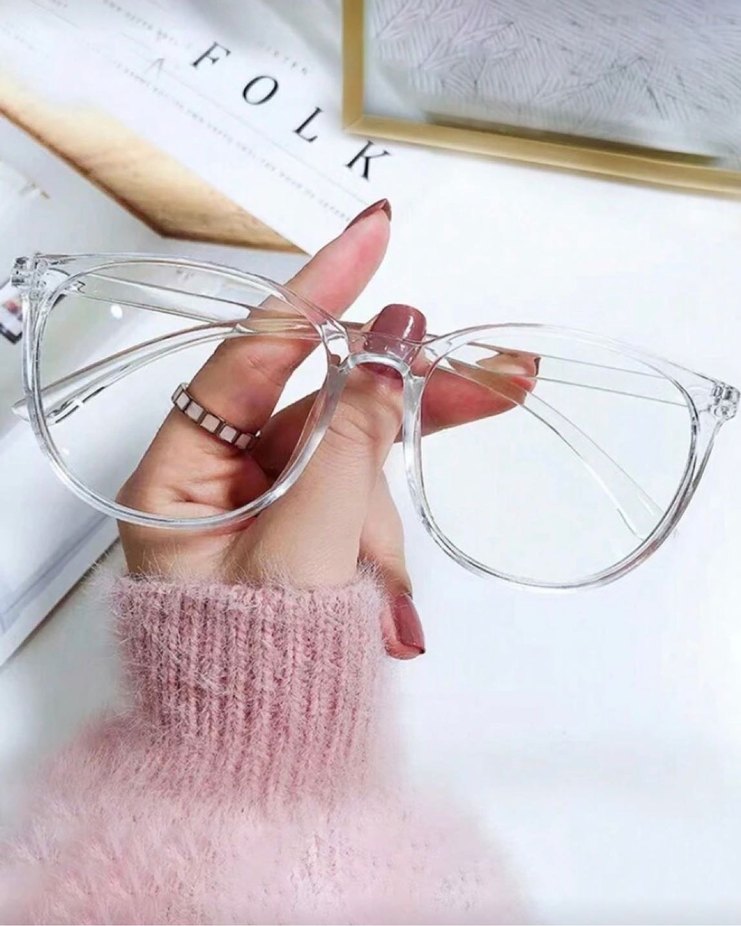 Şeffaf, minimalist tarzda kadın gözlüğü. Hafif ve çağdaş tasarımıyla trend günlük stil için uygun. Net çerçevesi modern bir dokunuş katıyor.
