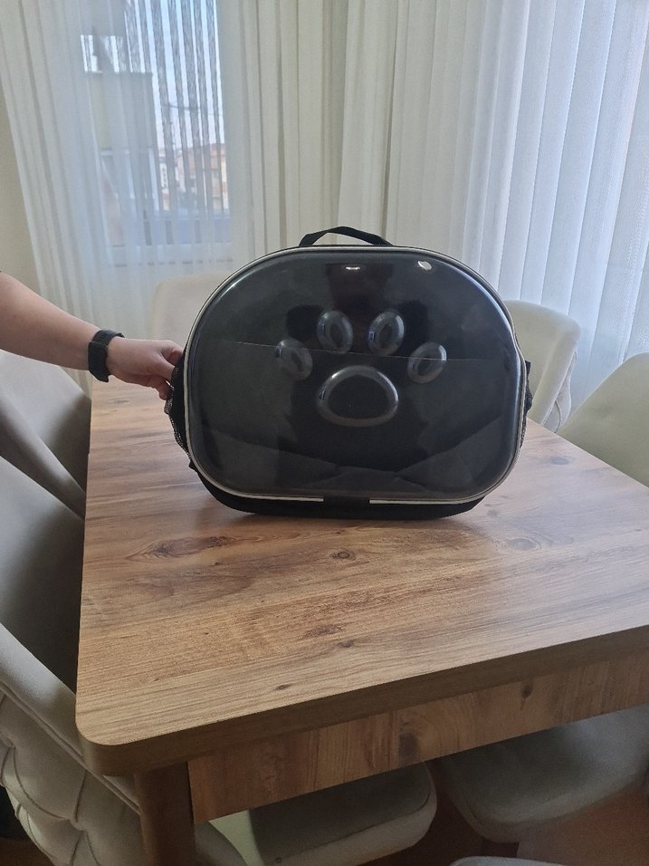 Siyah renginde, ön kısmı şeffaf ve pati desenli taşıma çantasıdır. Kolay taşınabilir sapı ve hava alabilir yapısı vardır. en 45 boy 38 cm hiç kullanılmadı tertemizdir