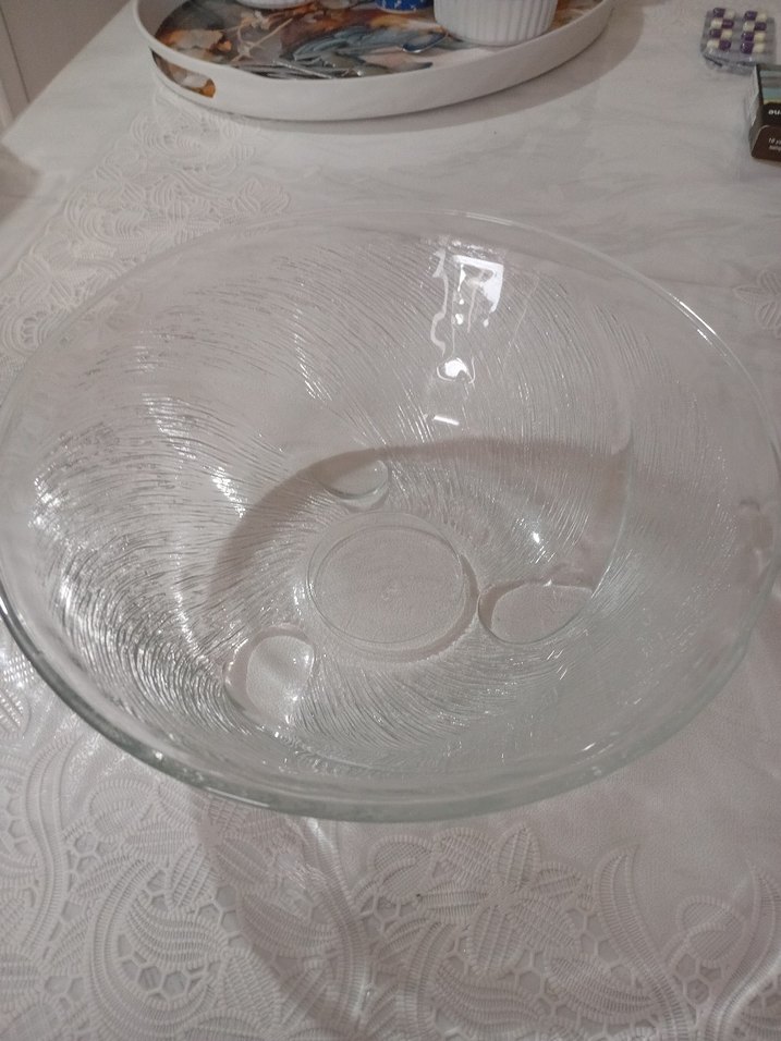 Parlak ve şeffaf camdan yapılmış, desen içermeyen klasik tarzda bir salata kasesidir.