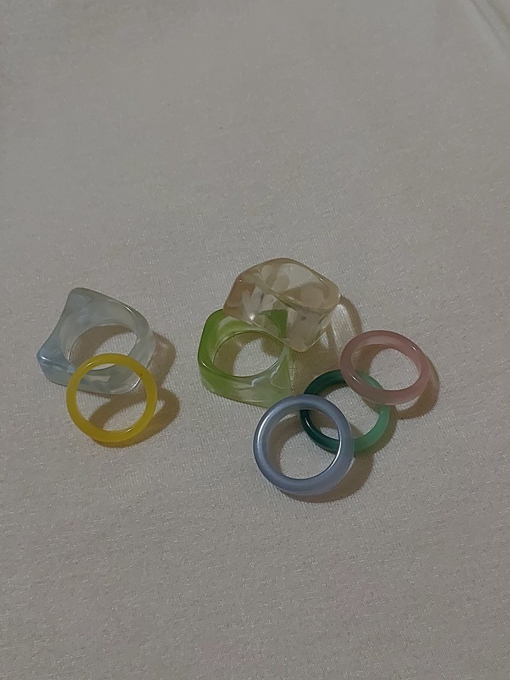 Şeffaf, pastel renklerde, desen içermeyen kadın yüzük seti. Bohem ve minimal tarzlara uygun, parti için ideal. 7'li set fiyatıdır.