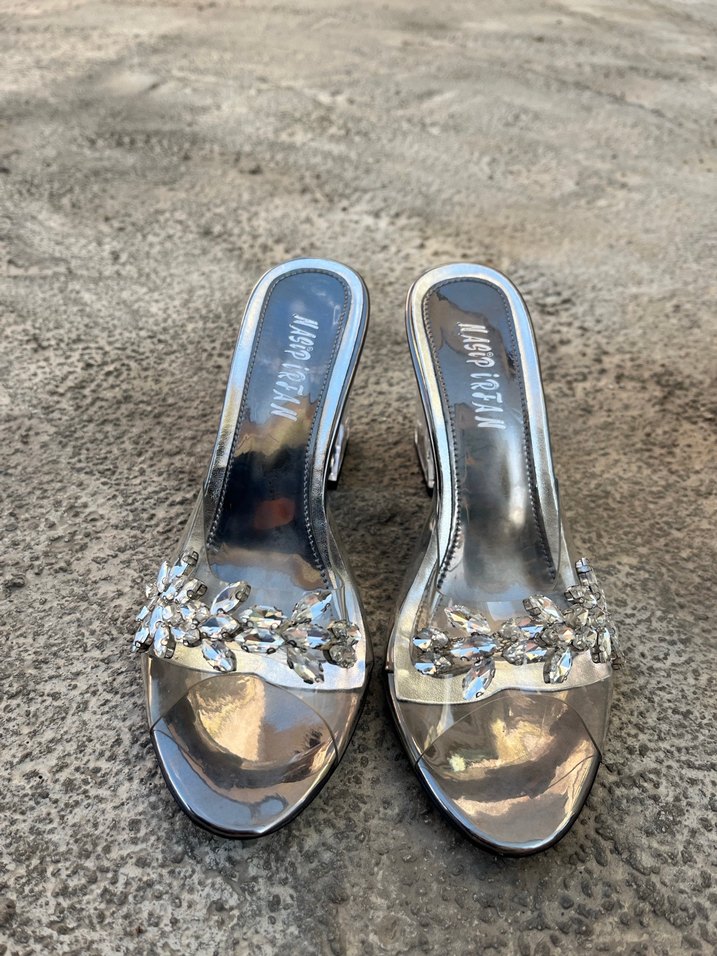 Gri yüksek topuklu, şeffaf taşlı abiye ayakkabı. Modern klasik tarzda, düğün için uygun.