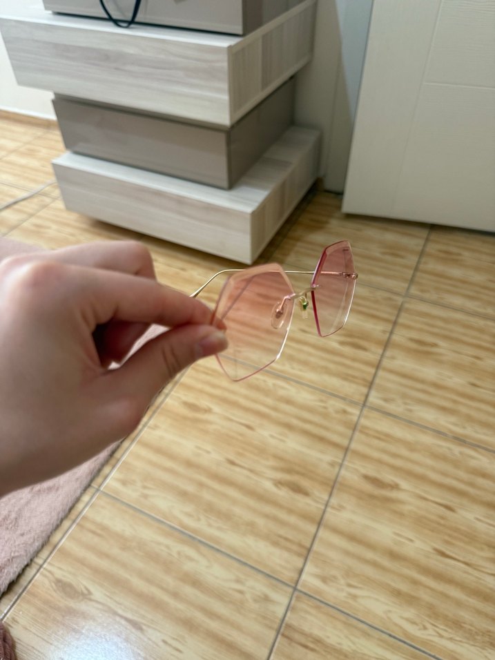 Şeffaf pembe çerçevesi gold ve pembe camları olan, minimalist ve bohem tarzda kadın gözlüğü. Retro ve hippie kişiliklere uygun.