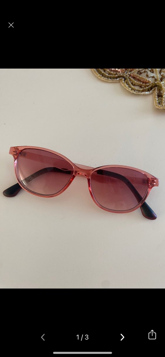 Şeffaf pembe çerçeveli, renkli camlı çocuk güneş gözlüğü. Bohem, hippie ve retro tarzıyla uyumlu, çağdaş ve minimal tasarım. Sadece camında küçük bir cizik var