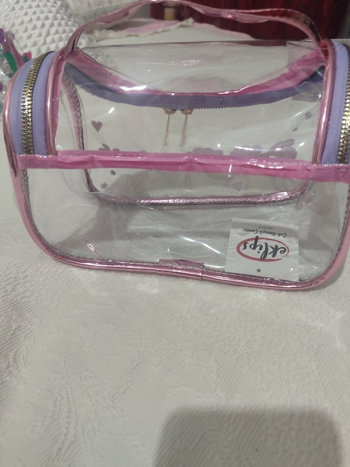 Şeffaf pembe renkte, fermuarlı ve minimal desenli kadın makyaj çantasıdır. Günlük kullanıma uygundur ve trendsetter, avangard tarzı sevenlere hitap eder.