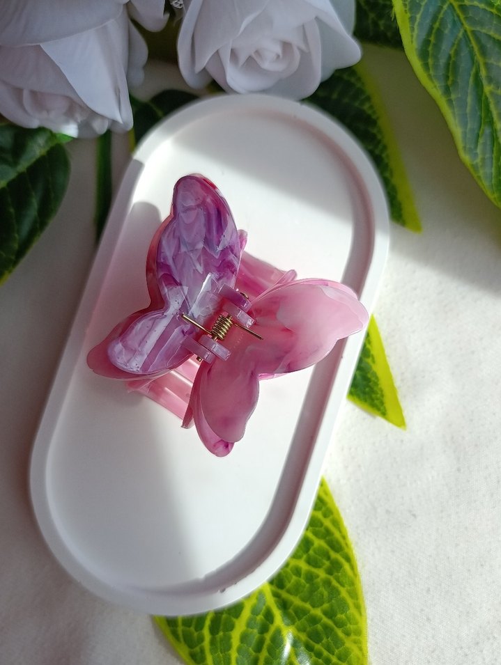 Renkli plastikten yapılmış, şeffaf pembe kelebek şekilli saç tokası, minimal ve modaya uygun tarz için ideal.