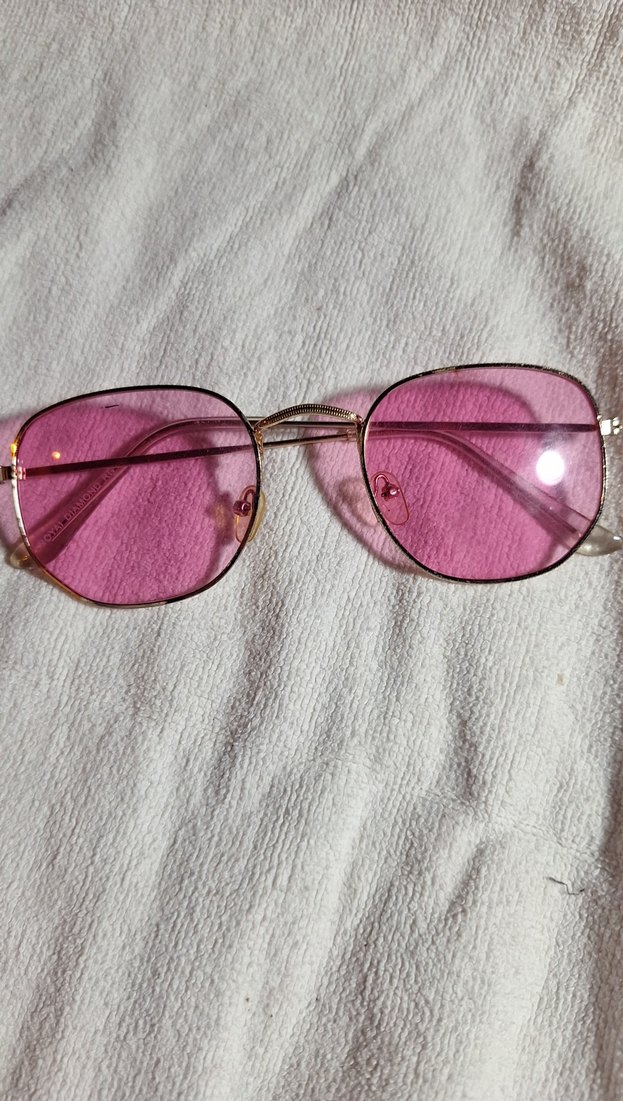 Şeffaf pembe camları ve minimalist, retro tasarımıyla kadın güneş gözlüğü, bohem ve karşı kültür tarzına uygun.