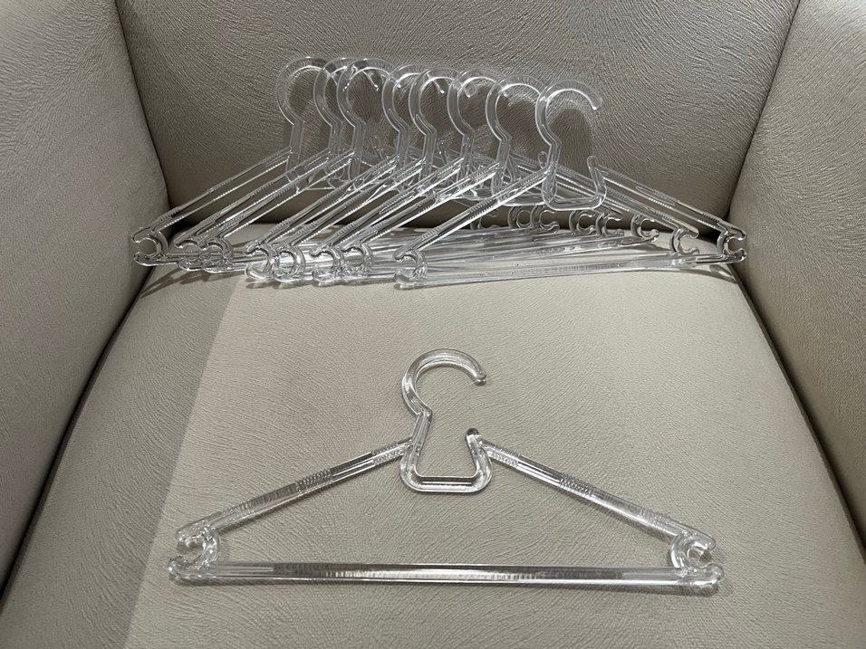 Kancalı ve omuz tutuculu şeffaf plastik askı seti, çeşitli kıyafetler için uygundur.