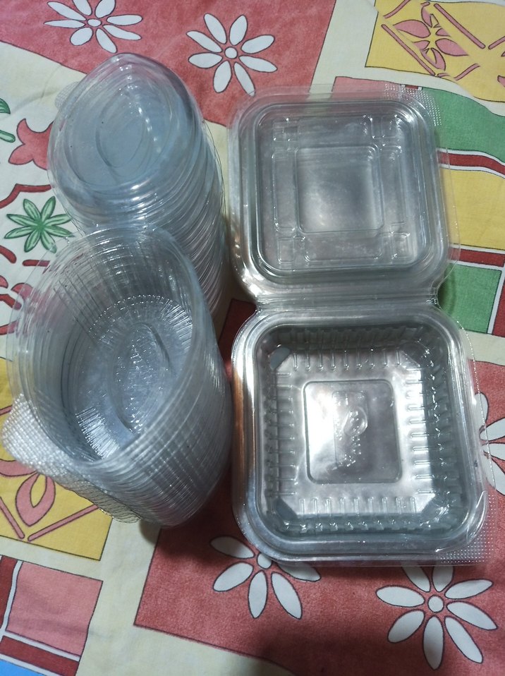 Çeşitli şekil ve boyutlarda şeffaf plastik gıda kapları, yiyecek saklama ve sunumu için uygundur.
