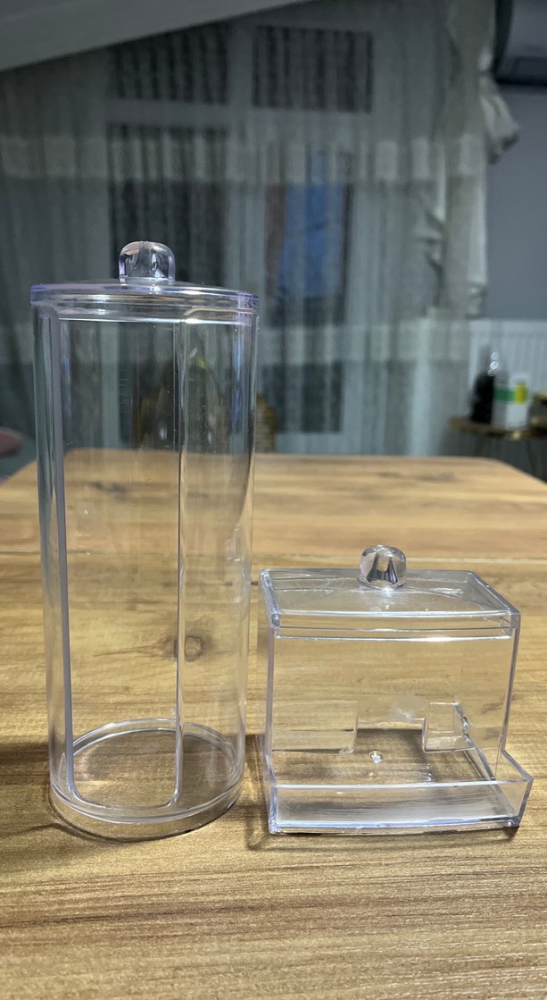 İki parçadan oluşan şeffaf plastik makyaj organizer seti; yüksek silindirik ve küçük kare kutu şeklindedir. Kozmetik saklamak için uygundur.