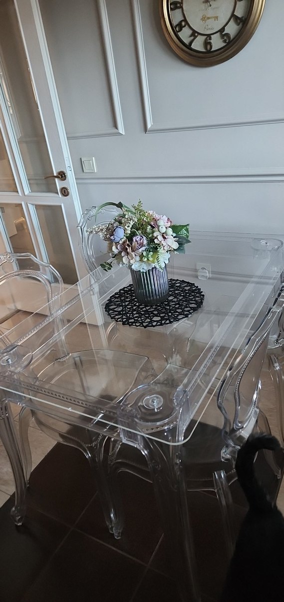 Şeffaf plastik masa ve sandalye seti, üzerindeki dekoratif paspas ve çiçek aranjmanı ile modern iç mekanlara uygun.