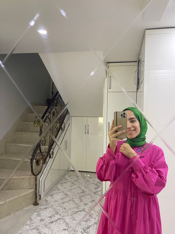 Uzun, bol kesim kadın yağmurluk, yüksek yaka ve uzun kolludur. İpek gibi şeffaf kumaştan, pastel pembe batik desenlidir. Modest ve sokak stiline uygundur. ️
