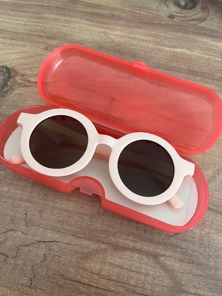 Yuvarlak pudra çerçeveli, şeffaf detaylı retro minimalist çocuk güneş gözlüğü. Pembe şeffaf koruyucu kutu ile birlikte.